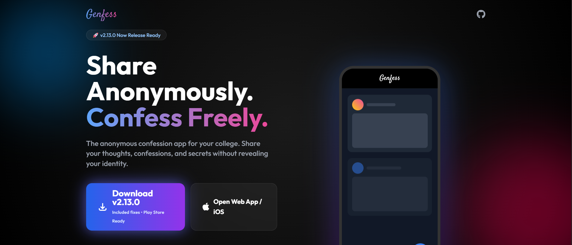 The Genfess launcher website introduces the anonymous campus platform to college communities — highlighting privacy features, community moderation, and secure student access to drive campus adoption.